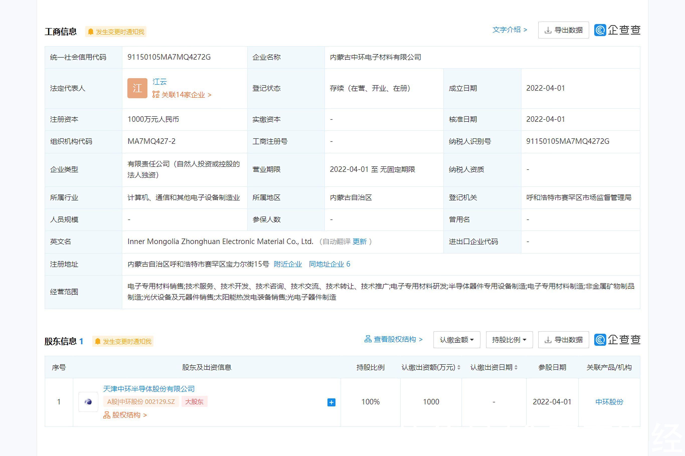 企查查APP显示,4月1日,内蒙古中环电子材料有限公司成立,法定代表人为江云,注册资本1000万元人民币,经营范围包含:光伏设备及元器件销售;太阳能热发电装备销售;光电子器件制造等。企查查股权穿透显示,该公司由中环股份(002129)100%控股。