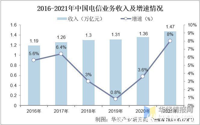2016-2021年中国电信业务收入及增速情况