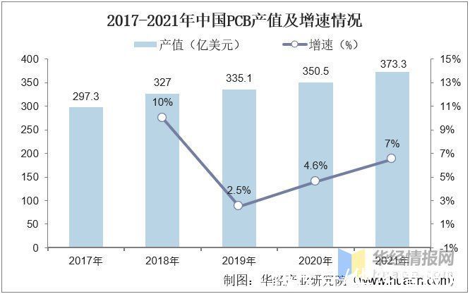 2017-2021年中国PCB产值及增速情况