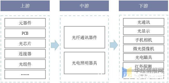 光电子器件行业产业链上游主要为电子元器件、PCB、光芯片、连接器等材料;下游应用领域包括光通讯、光显示、手机相机、微光摄像机、光电瞄具、红外探测等领域。