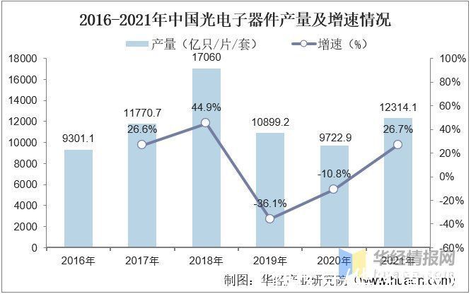 2016-2021年中国光电子器件产量及增速情况