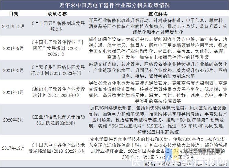 近年来光电子器件行业部分相关政策一览表